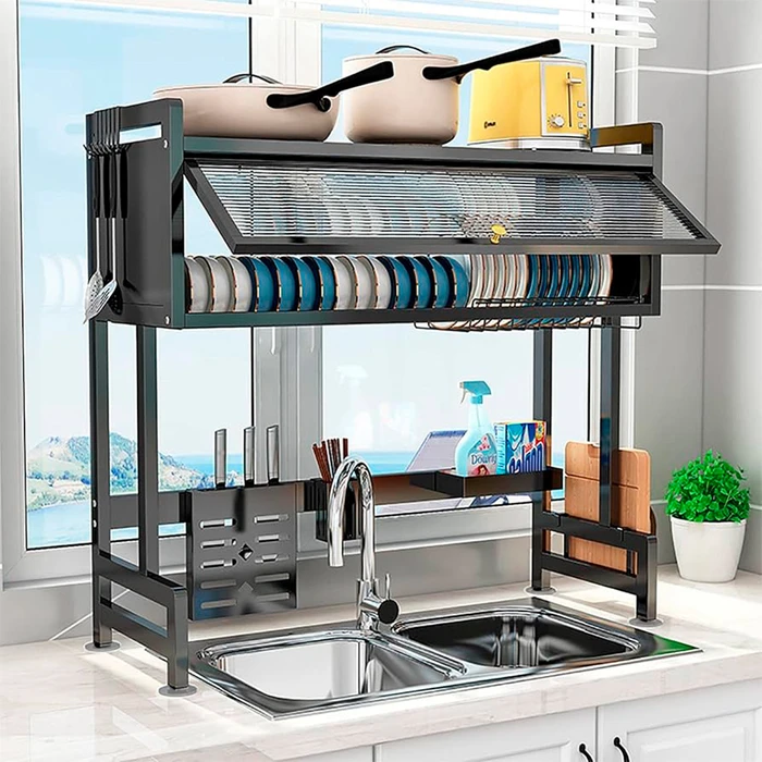 Escurridor de Vajilla Rack Organizador con 2 Estantes y Puerta de Acrílico