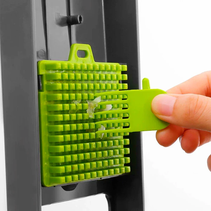 • · Incluye: 7 accesorios de corte(Cuchillas para cortar en cubos de 21×21/ 11x11mm, rallador grueso, ralladores de 3/4mm, rebanador de 1mm, rebanador ondulado), separador de clara de huevo, pelador, cepillo de limpieza, cortador de prensa, protector, cesta de drenaje y bolsa de almacenamiento.